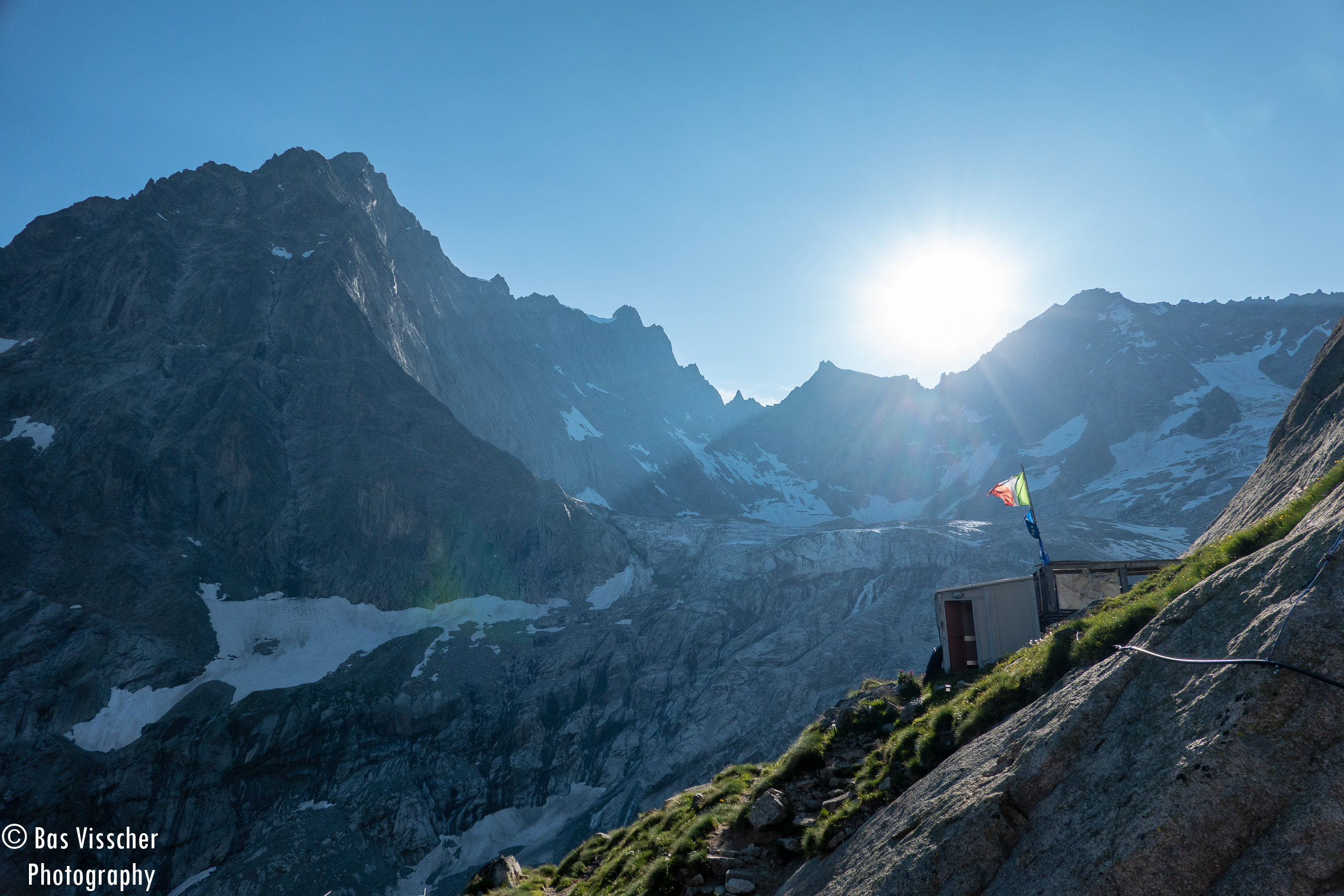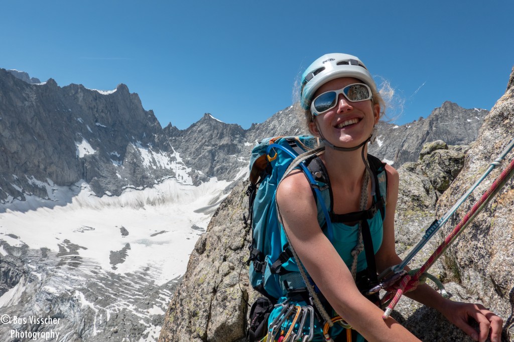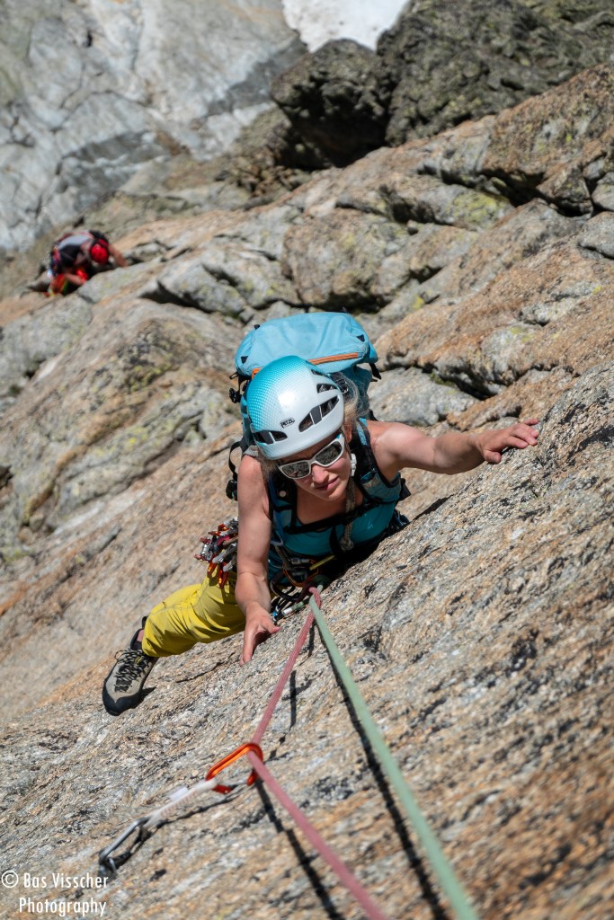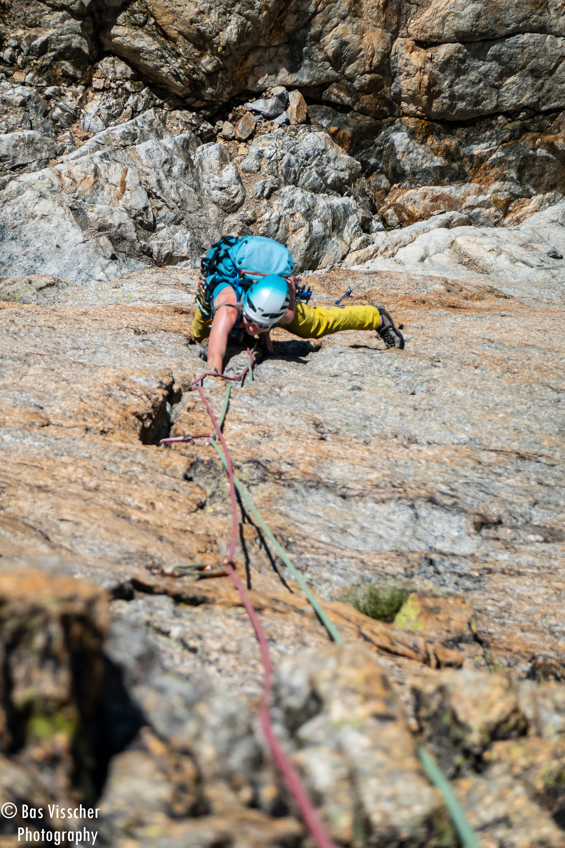 Een van de leukste tochten van afgelopen zomer was de ‘Christellina (6B+)’ met Dorien op de Mont Rouges de Triolet. Je klimt deze route vanuit de Dalmazzi hut in het Val Ferret, een prachtige, wilde plek aan de zuidkant van het Mont Blanc gebied. Ik was nog nooit in deze hut geweest en ik vind het altijd leuk om nieuwe plekken te ontdekken. En nu ik er geweest ben kan ik zeggen dat het zeker de moeite waard is. Het dal is erg mooi, de aanloop is niet al te lang (circa 2,5 uur) en de mensen van de hut zijn aardig. En vooruit, nog meer pluspunten: je hebt namelijk een gratis topo, geen Chamonix- stress voor het halen van de laatste lift, het is niet al te druk (wij deelden de hut met 10 anderen) en last but not least, het klimmen is er zeker de moeite waard.