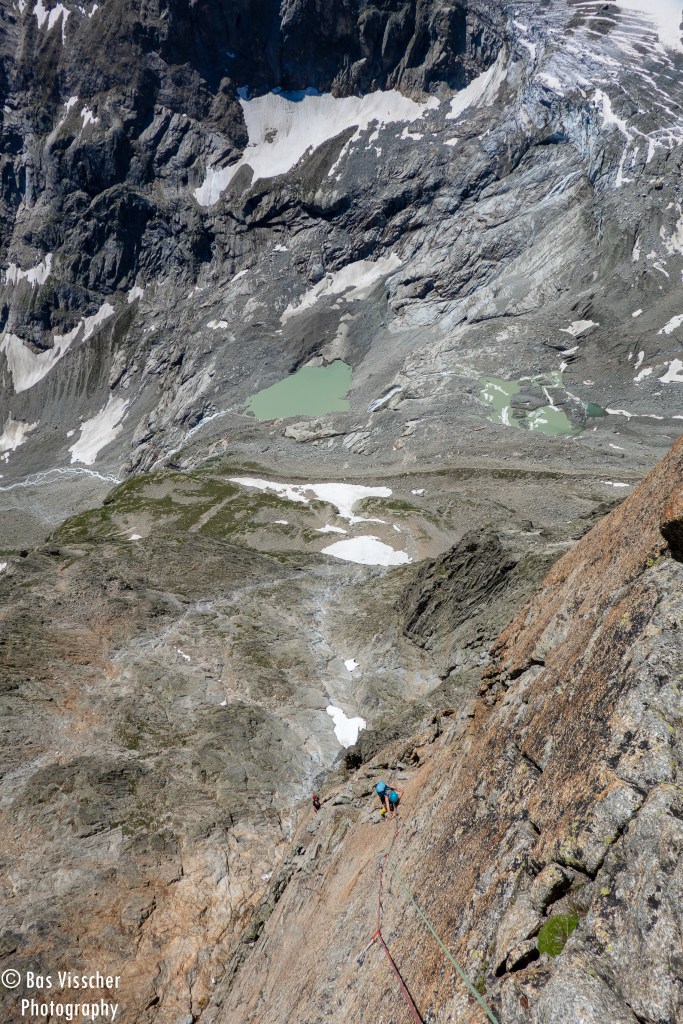 Ook daarna komen nog mooie lengtes. De 6B+ sleutellengte is tricky, maar goed te doen als je de beste ondergrepen weet te vinden en op je voetenwerk let. En het scheelt dat de boorhaken steeds precies op de juiste plekken zijn geplaatst. Vanaf de standplaats heb je mooi uitzicht op de gletsjer aan de overkant. Ik vrees wel dat door de klimaatverandering deze gletsjer in hoog tempo zal verdwijnen. Zo zonde….