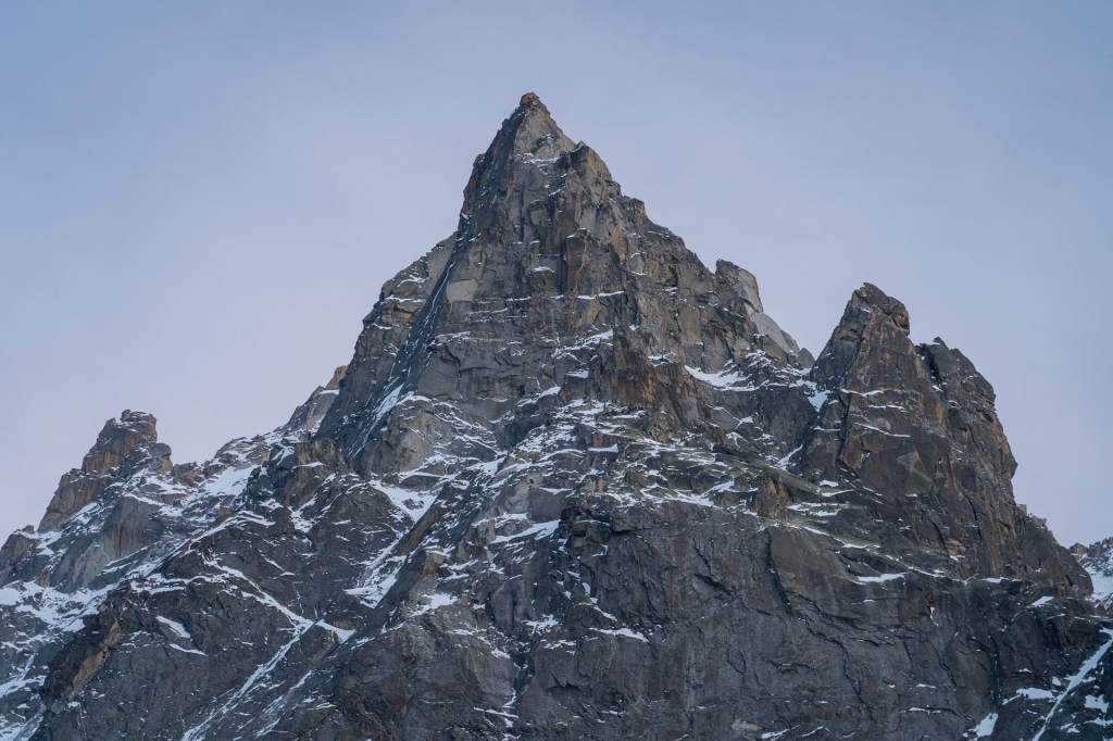 We vertrekken rond 5:45 bij de tent en proberen het spoor te volgen dat naar de instap loopt. Soms is de sneeuw hard, maar vaak zakken we toch nog weg in de verse poeder van afgelopen weekend. Gisteren zagen we nog hoe een helikopter een reddingsactie uitvoerde boven de crux van de Fil a Plomb. Dit team liep hier gisteren ook -waarschijnlijk vol goede moed- onderweg naar een nieuw avontuur. Net zoals wij dat nu doen. Wat zou er met hun gebeurd zijn? Ik hoop dat alles goed is afgelopen.