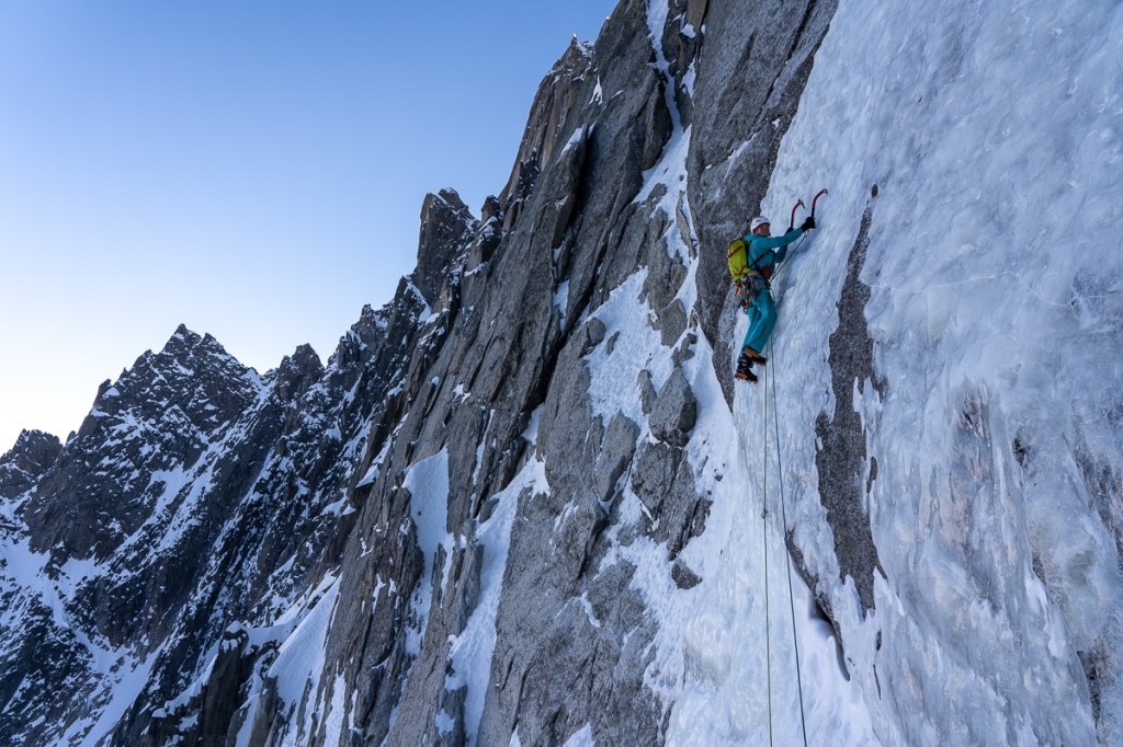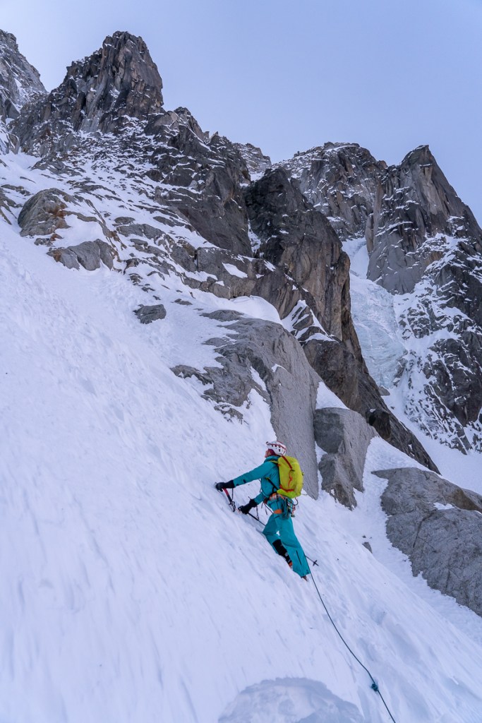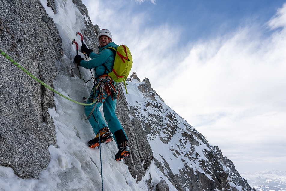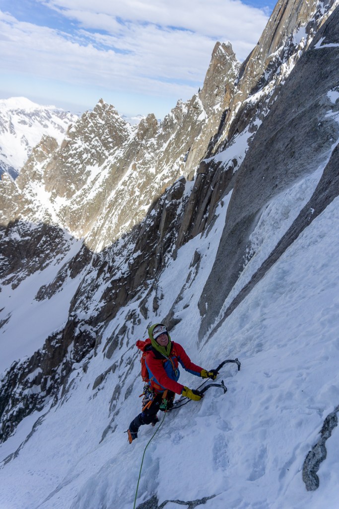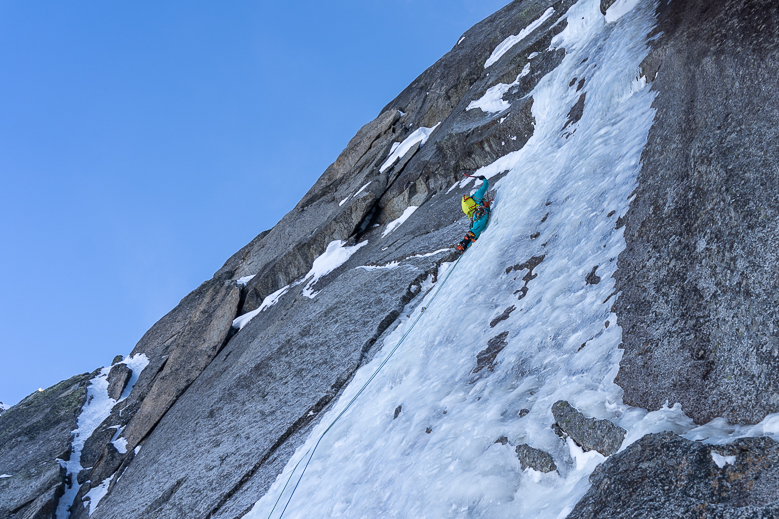 We laten gauw de mixed lengtes achter ons en deze keer is het aan Line de eer om de steile crux lengte voor te klimmen. De condities zijn gelukkig beter dan in 2007. Meer ijs en meer gehakte gaten van eerdere klimmers. Het begin is loodrecht en verzurend. Na een paar meter wordt het minder steil en wordt het genieten. Line gaat lekker, maar als ze halverwege de lengte is, begint de spindrift. De stuifsneeuw is niet prettig, maar ze gaat rustig door. Als ik naklim weet de spindrift mij ook te pakken te nemen. Ik heb mijn capuchon op, maar de koude sneeuw stroomt toch langs mijn gezicht. Mijn handen worden koud van het knijpen in de bijlen. Eenmaal op de stand komt het gevoel terug. Ik krijg screaming barfies, een misselijkmakend gevoel van pijn die me doet schreeuwen.