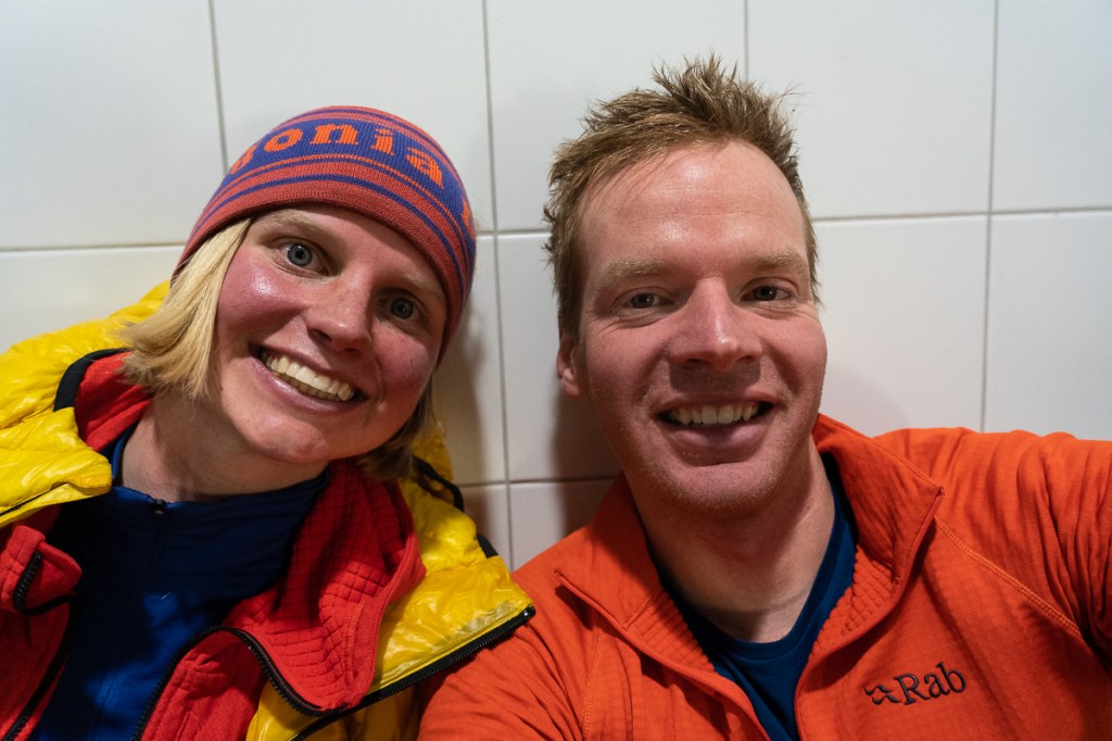 Rond 18:00 trekken we de deur van het liftstation achter ons dicht. We kunnen pas morgen ochtend naar het dal, maar we zingen onze tijd hier wel uit. De enige verwarmde plek is het toilet. We installeren ons op de koude tegels en ik kruip in mijn plastic bivakzak. Na zo’n lange dag vol inspanning maakt het allemaal niet meer uit. Zonder slaapzak en matje is het zelfs nog een beetje fris. Elk uur gaan er mysterieuze, automatische luchtverfrissers aan en de sensoren van de lampen worden al geactiveerd bij een kleine beweging. Maar het kan ons niets meer schelen, want we hadden een fantastische dag in een mooie, winterse Fil a Plomb. Hier zat ik al een tijdje op te wachten.