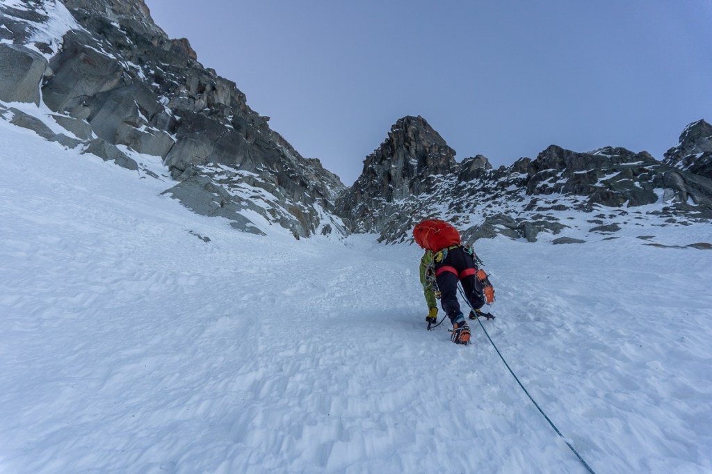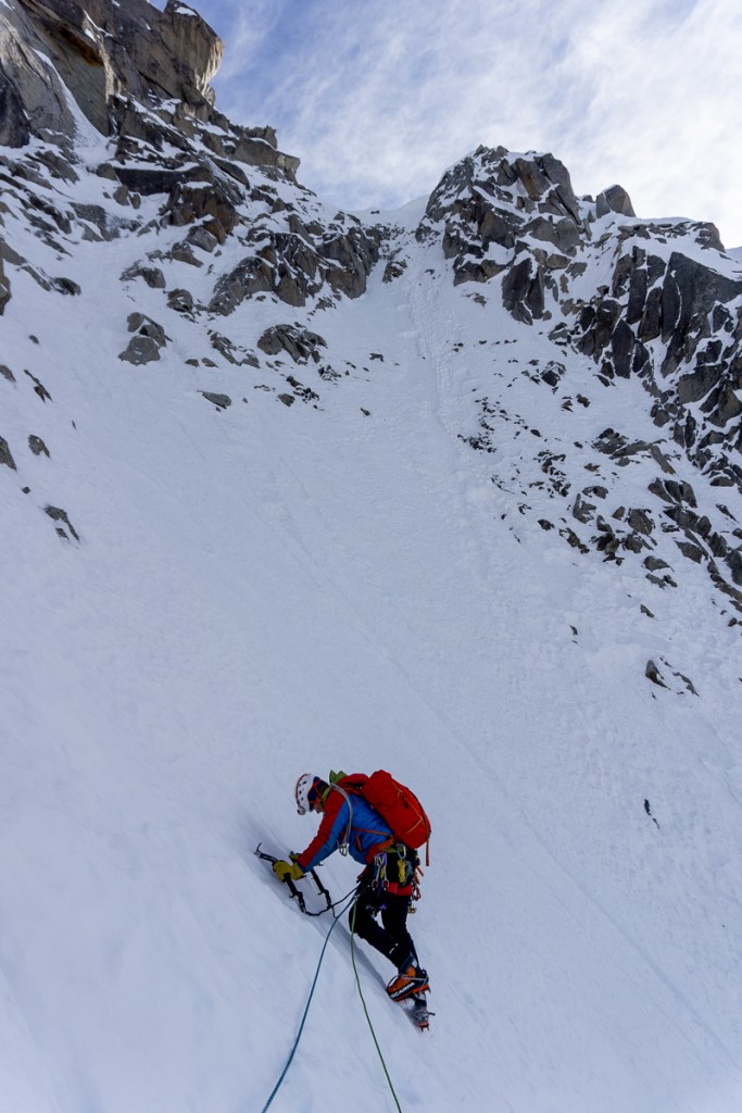 Na een paar minuten zijn mijn handen weer warm. We genieten van het technische klimmen. Zoveel ijs is er niet, maar het is genoeg om erdoor heen te komen. Daarentegen is er wel heel veel sneeuw, te veel zelfs. Het sporen valt ons zwaar en in het laatste deel van de route verliezen we veel tijd door de diepe poeder. We staan om 15.00 op de col en weten dan al dat we de laatste lift waarschijnlijk niet gaan halen.