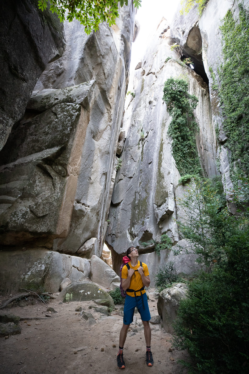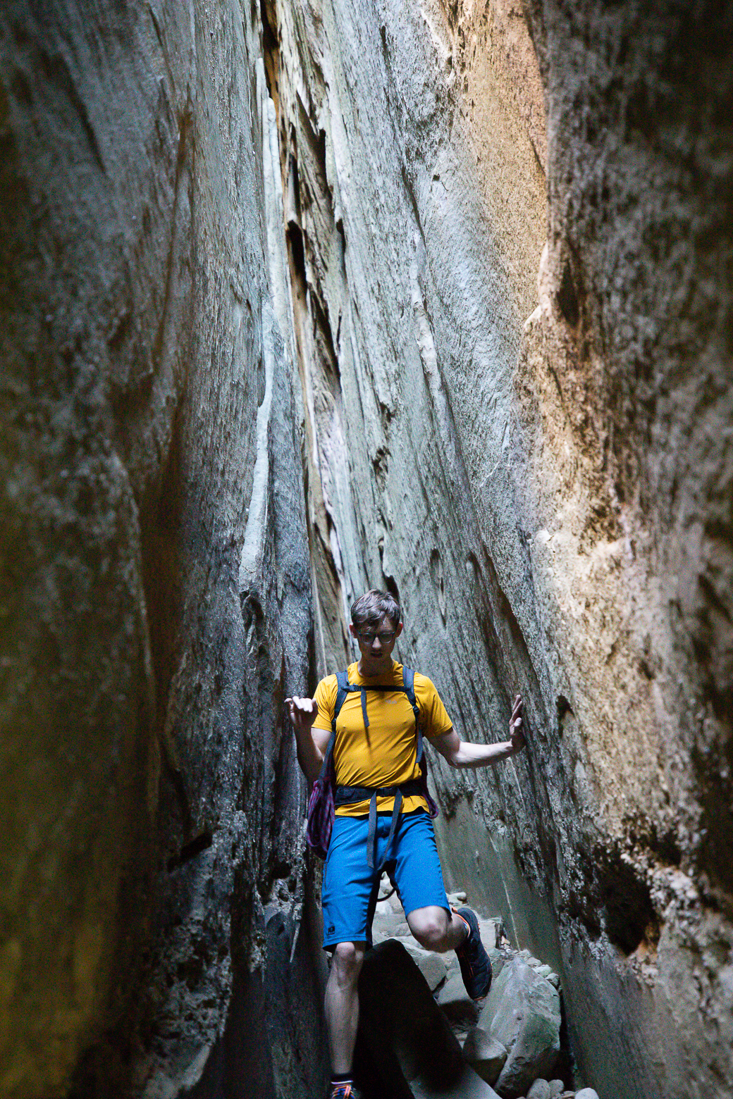 Het wordt nu meer een fysieke full body work-out. Op een gegeven moment staat er ‘pied-a-dos’ in de topo, oftewel met je rug op de muur en met je voeten op tegendruk tegen de andere wand. Het is een moeizame manier van voortbewegen, maar het voordeel is wel dat je niet zomaar valt omdat je klem zit. Willem is slim bij het naklimmen en hangt de rugzak aan een slinge onder zich. Als het later mijn beurt is om te na te klimmen door een schoorsteen, wens ik dat ik minder koppig was geweest en hetzelfde had gedaan. Wat een geploeter met die tas op je rug….