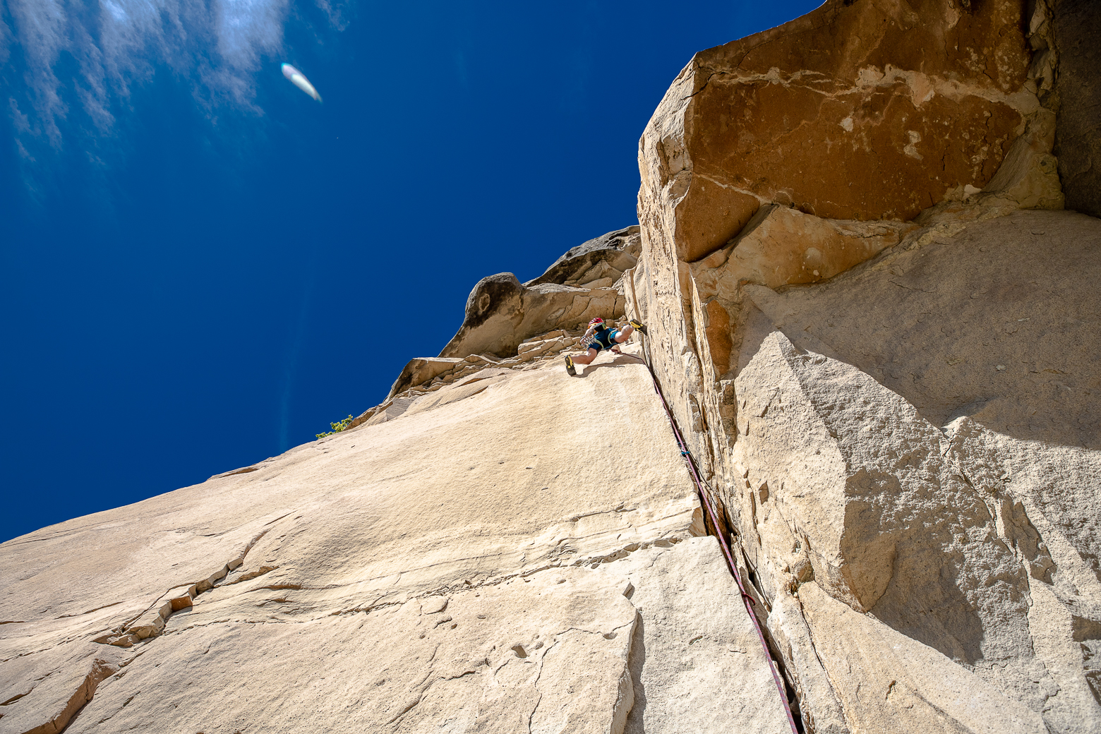 De route is decennia geleden geopend. Echt een topprestatie als je bedenkt dat de protectie toendertijd vooral uit mephaken en houten wiggen bestond. Tegenwoordig zitten er altijd wel een paar boorhaken in de lastigste passages van de lengtes. En met een rack camalots is de afzekering geen enkel probleem. Het onderste deel van de route volgt spleten en versnijdingen, en het bovenste deel loopt door een grote schoorsteen.